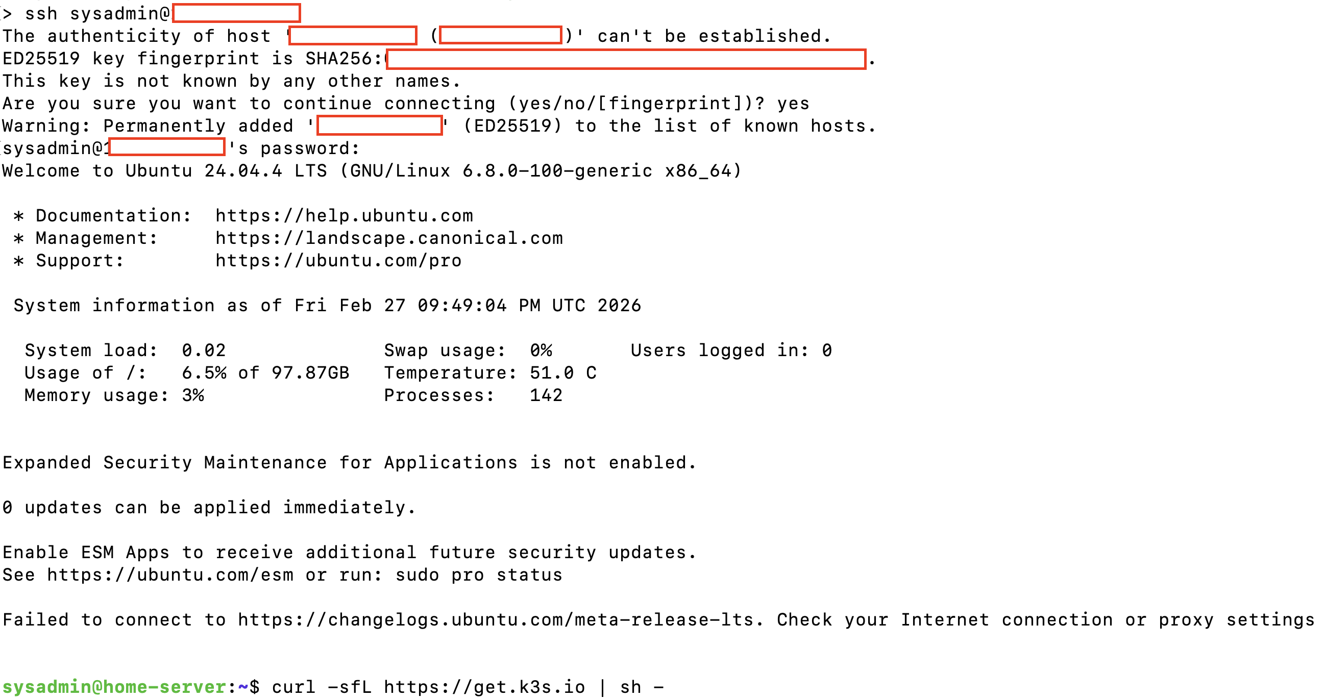 ssh "Pick a username에 입력했던 값"@"서버IP주소" # 예: ssh systemadmin@192.168.0.1